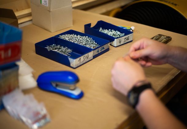 Hier wird Velozubehör gebohrt, verschraubt und konfektioniert. Ebenso werden Kartonagen gefaltet, geklebt und verpackt.